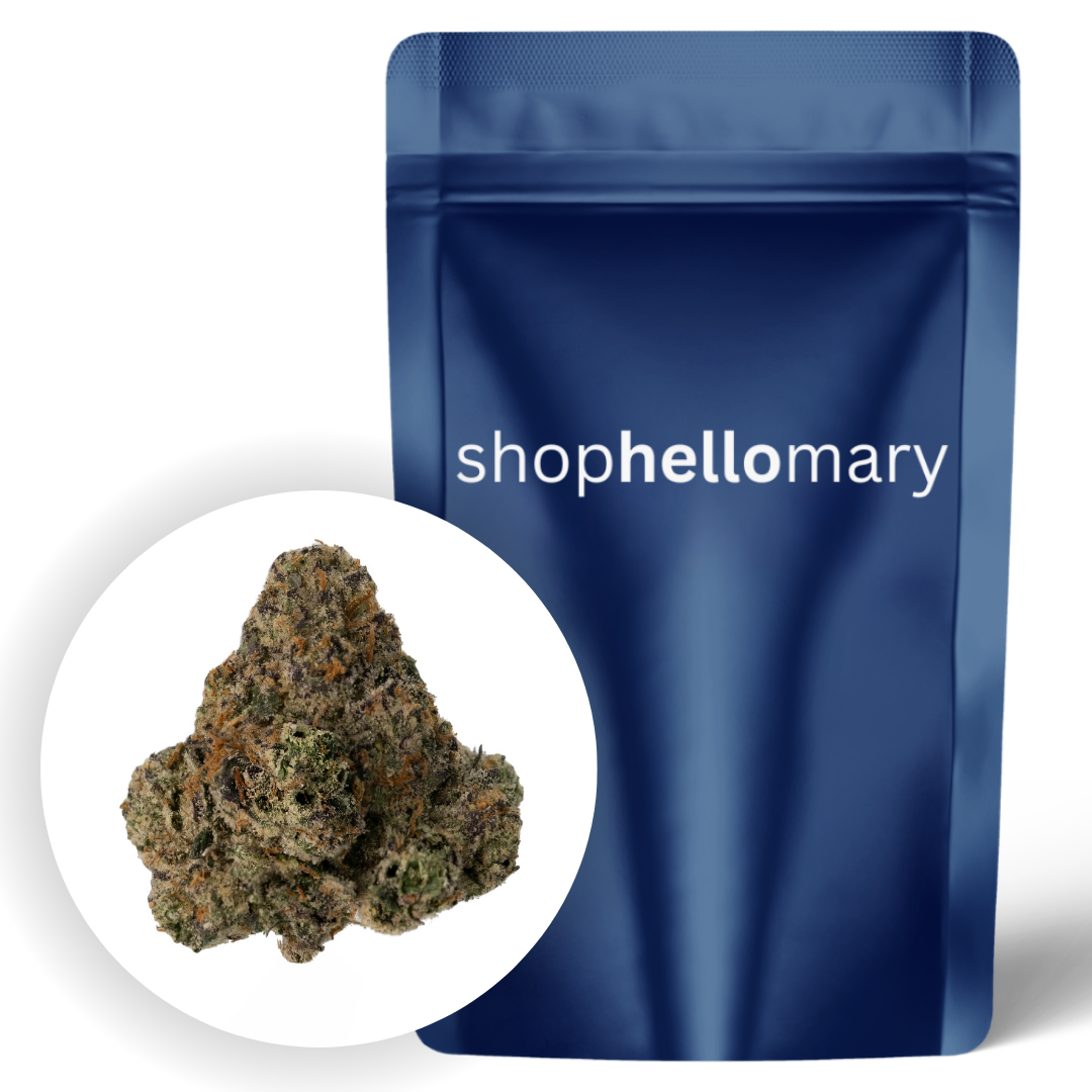 Shop Hello Mary’s Black Mamba is an indica-dominant hybrid featuring dense, frosty buds in deep green with subtle purple hues and bright orange hairs. Rich notes of grape and sweet berry blend with a light floral earthiness, creating a smooth, flavorful smoke. The effects settle in with a euphoric head lift before melting into a calming, full-body relaxation that can lean slightly sleepy, making it a solid choice for unwinding at the end of the day.