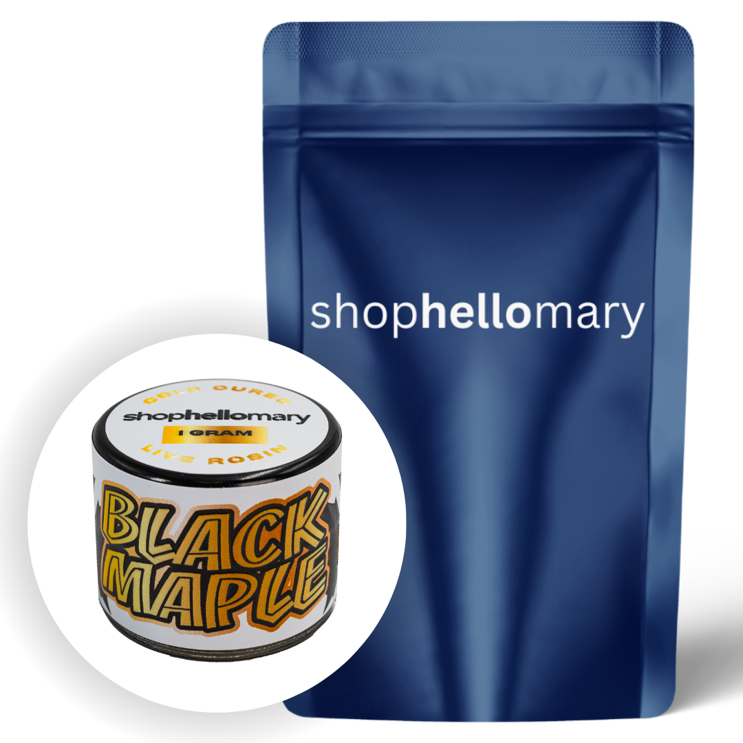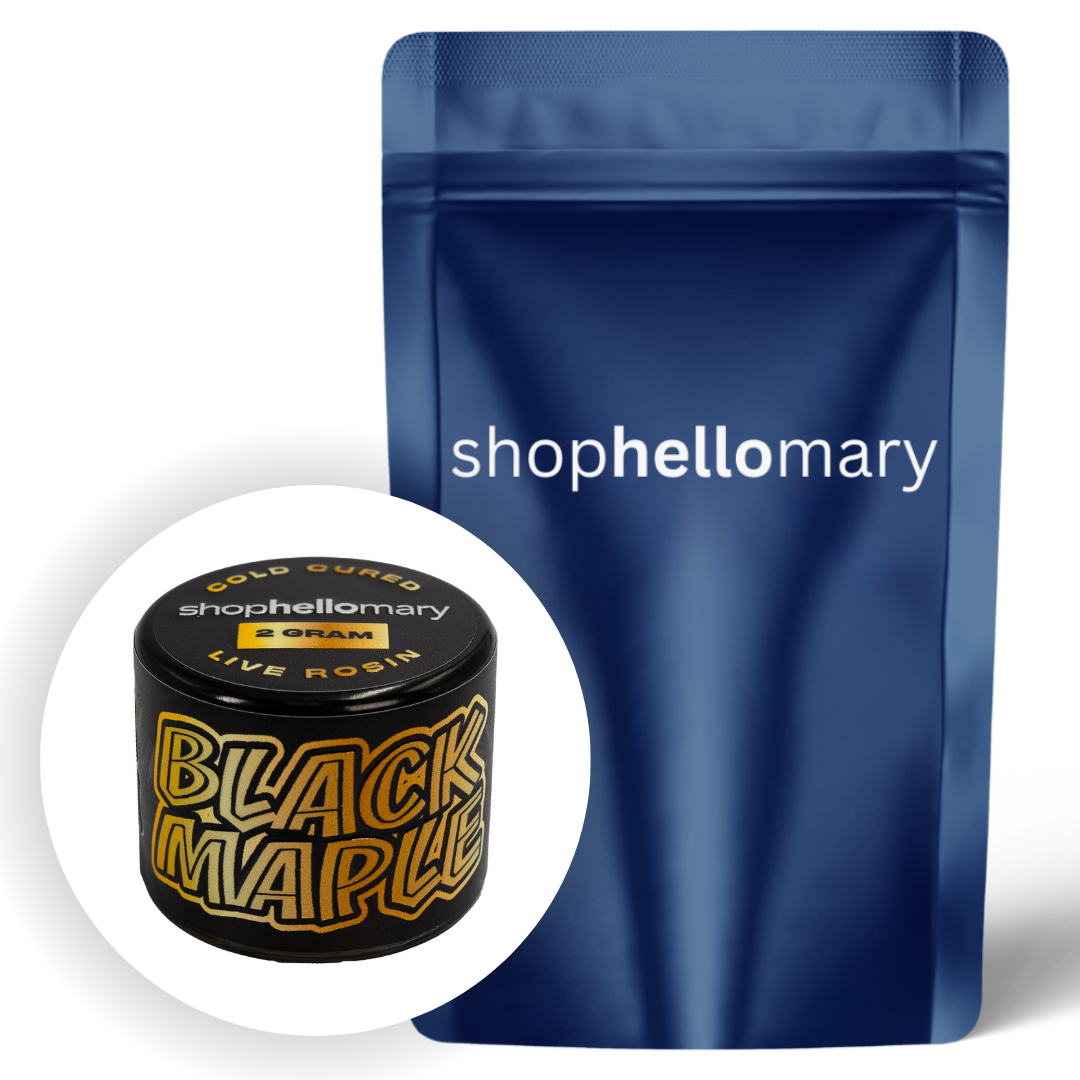 Shop Hello Mary’s Black Maple Rosin delivers a sweet, candy-like profile with maple syrup, citrus, and a hint of peppery spice. This solventless concentrate produces smooth, terpene-rich pulls with a gradual heady lift that melts into a calming, body-heavy finish. Available in 1g or 2g jars.
