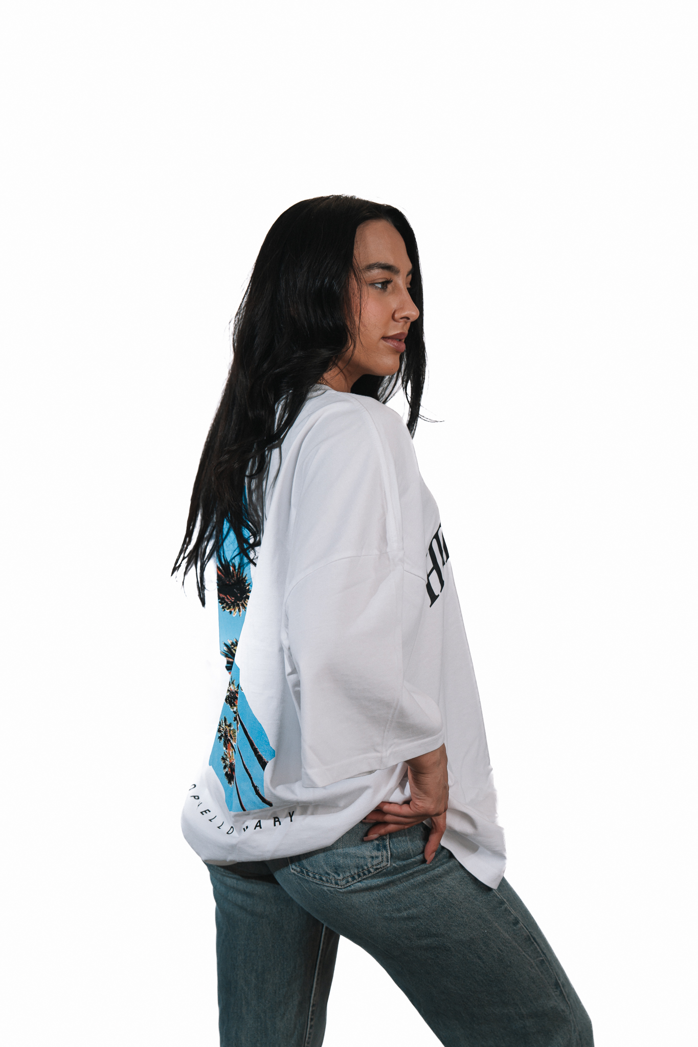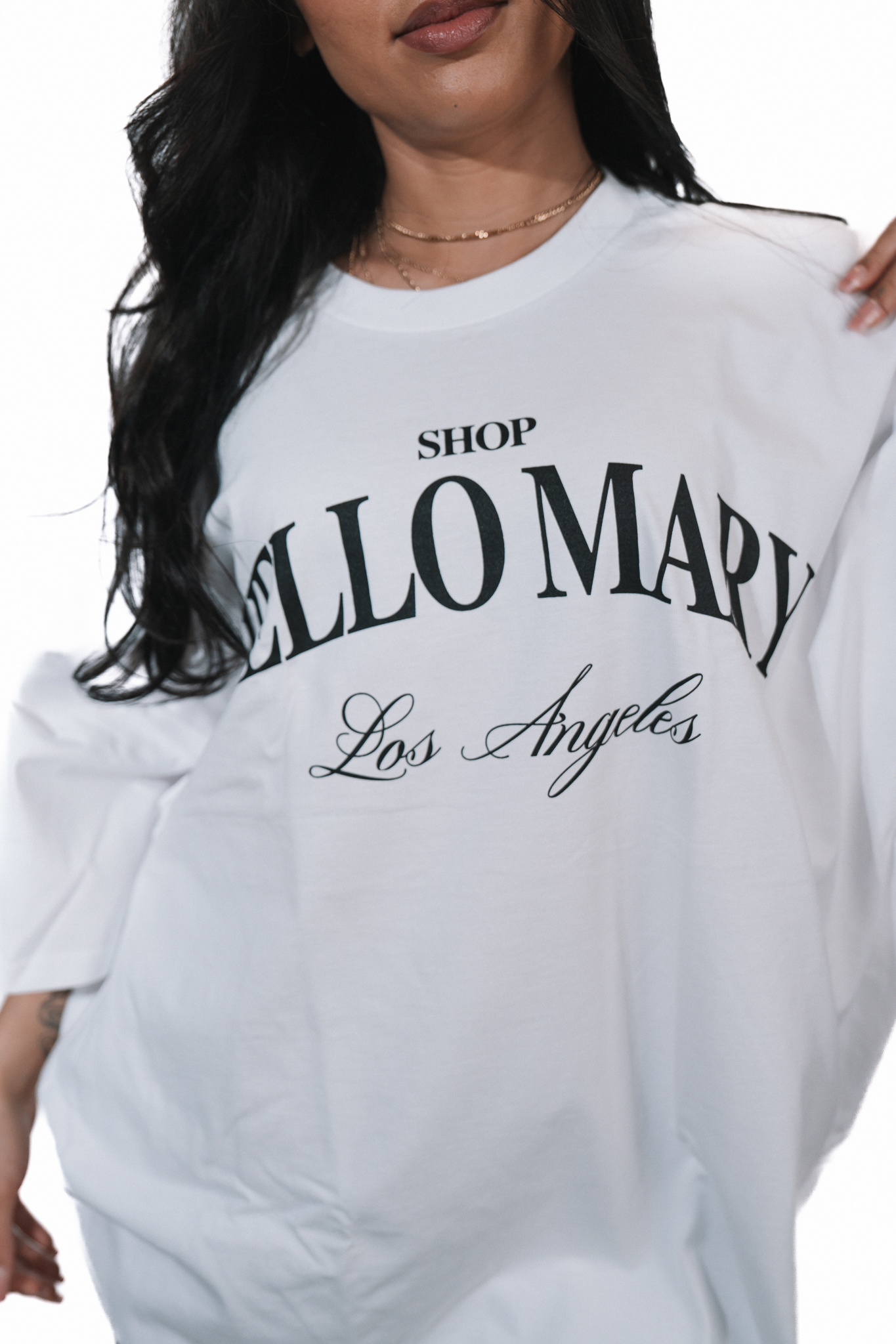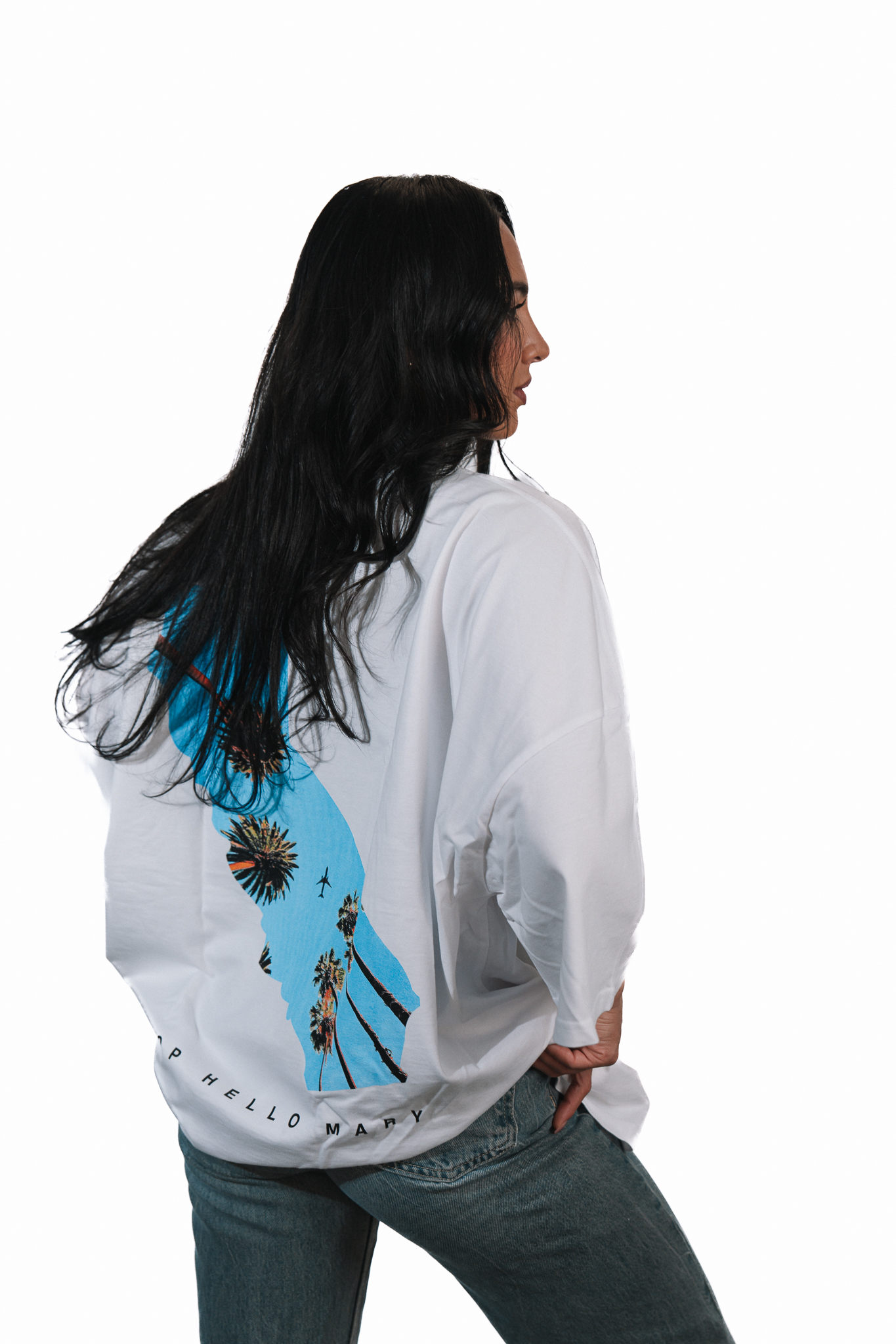 Designed for everyday comfort with a laid-back California vibe, the Shop Hello Mary Los Angeles Tee is a unisex staple made for relaxed, effortless style. This oversized white T-shirt features a bold Shop Hello Mary Los Angeles graphic across the chest for a clean, classic statement. The back showcases a vibrant California state silhouette with palm trees and sky details, bringing a sun-soaked West Coast feel to the design. Soft, breathable, and easy to wear, this tee pairs perfectly with denim, lounge sets, or layered under your favorite jacket for a casual California look.