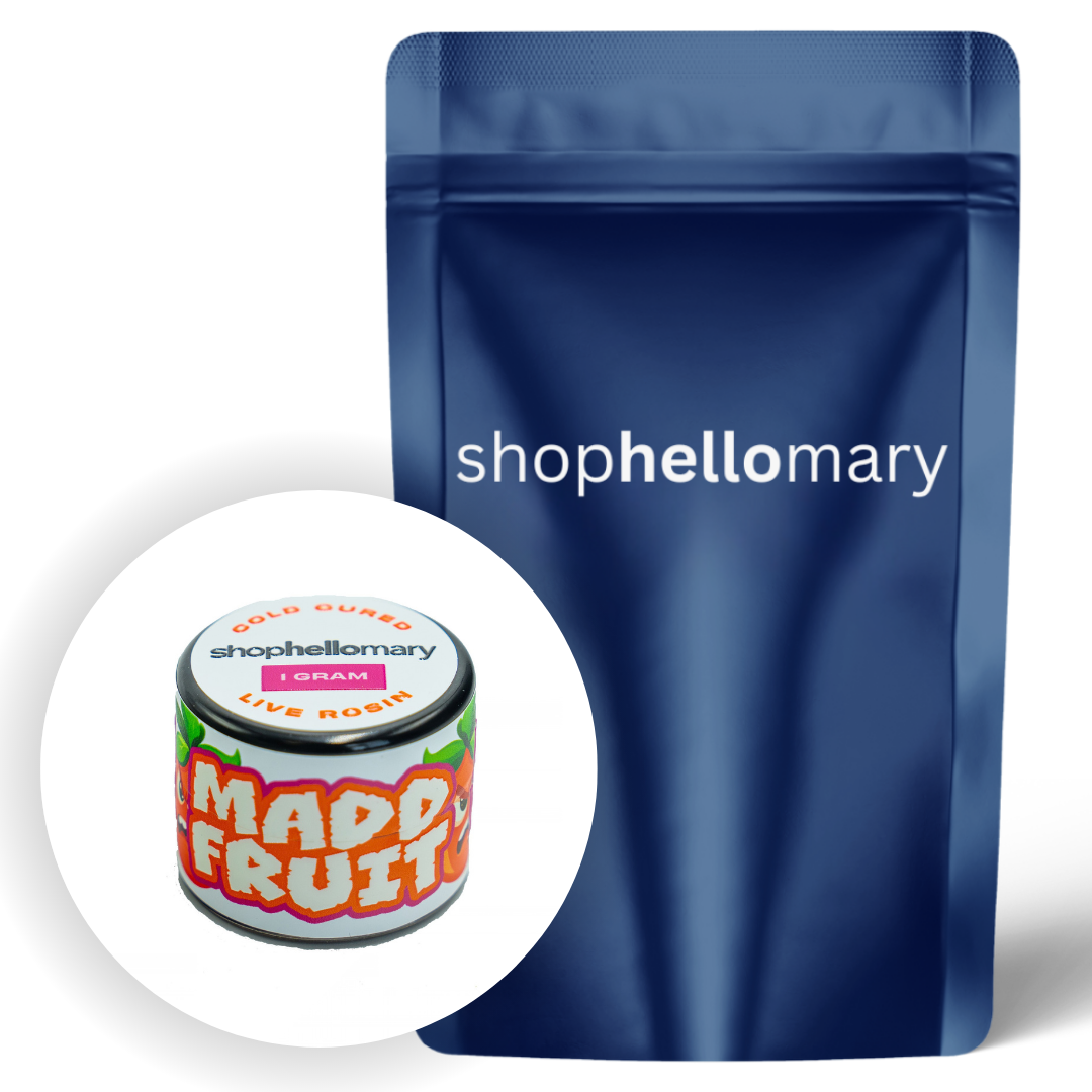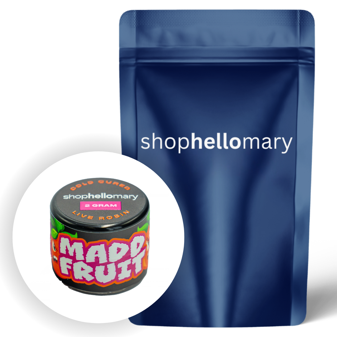 Shop Hello Mary’s Madd Fruit Rosin is a terpene-rich, indica-dominant concentrate bursting with ripe papaya, juicy berries, and sweet tropical candy layered over subtle earthy spice and musky depth. Carefully pressed for a clean, solventless finish, it delivers bold, fruit-forward flavor with a smooth, creamy exhale that lingers. The effects arrive quickly with a calming cerebral ease before sinking into deeply soothing, full-body relaxation and steady comfort. Ideal for stress relief, tension release, and slow, laid-back evening sessions.
