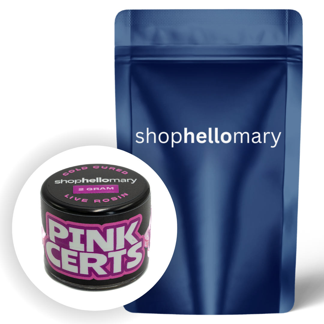 Shop Hello Mary’s Pink Certz Rosin brings a bold, flavor-forward hybrid profile with juicy grape candy sweetness layered with cool mint and a light touch of diesel. Crafted as a premium solventless concentrate, it produces rich, resinous pulls with a sweet, fruity inhale and a crisp mint-fuel exhale. The effects open with an uplifting cerebral buzz that encourages creativity and focus before easing into calm, balanced body relaxation. Available in 1g or 2g jars.