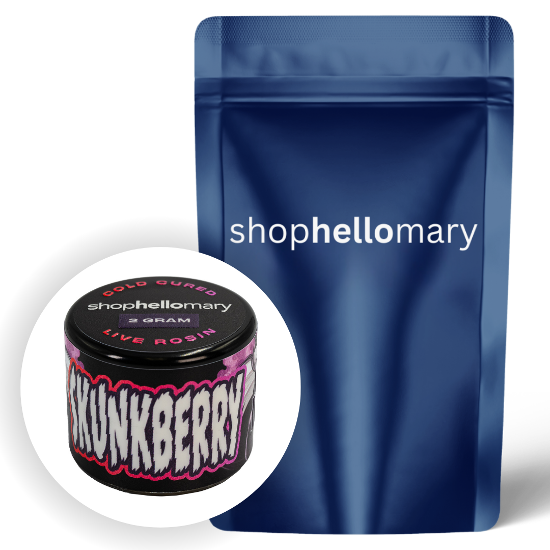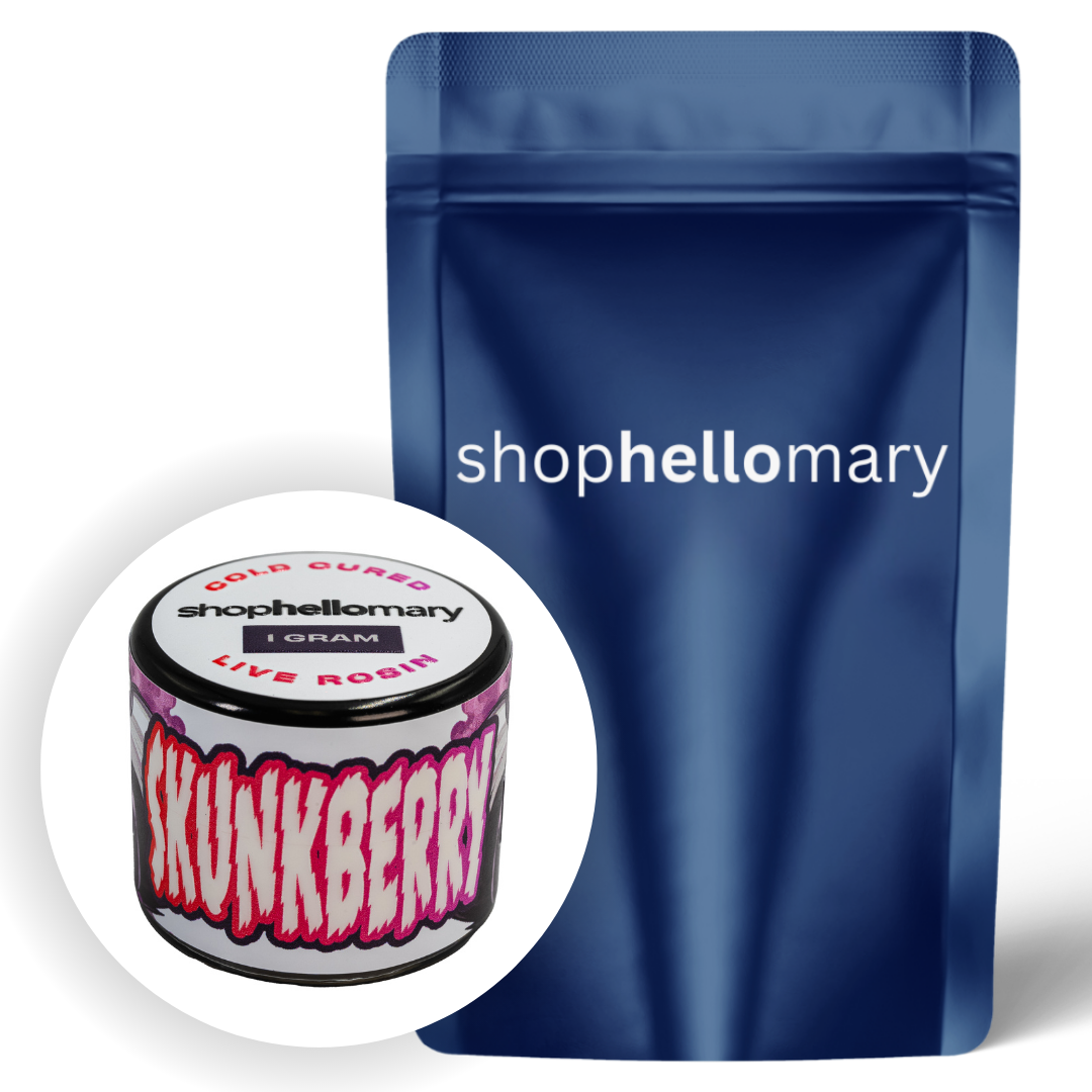 Shop Hello Mary’s Skunkberry Rosin opens with sweet ripe berry and sour lemon citrus layered over a pungent skunky, earthy funk. This solventless concentrate delivers smooth, terpene-rich vapor that hits fast with a powerful cerebral rush, sparking giddy, creative energy and euphoric lift before settling into a heavy, relaxing body high that can anchor you to the couch. Available in 1g or 2g jars.